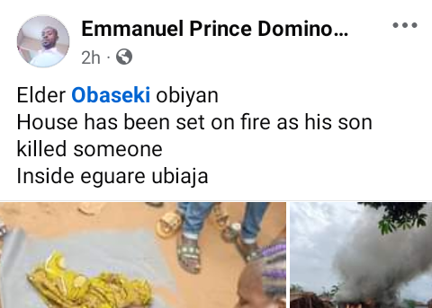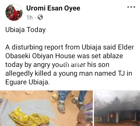 Angry youths in Eguare Ubiaja, Esan South-East Local Government Area of Edo State reportedly set a community leader’s house ablaze after his son allegedly k!lled a young man. The incident reportedly occurred on Friday, August 16, 2024. It was gathered that elder Obaseki Obiyan’s son st@bbed the young man identified simply as TJ, to dath. Details of the incident are still sketchy at the time of filing this report.